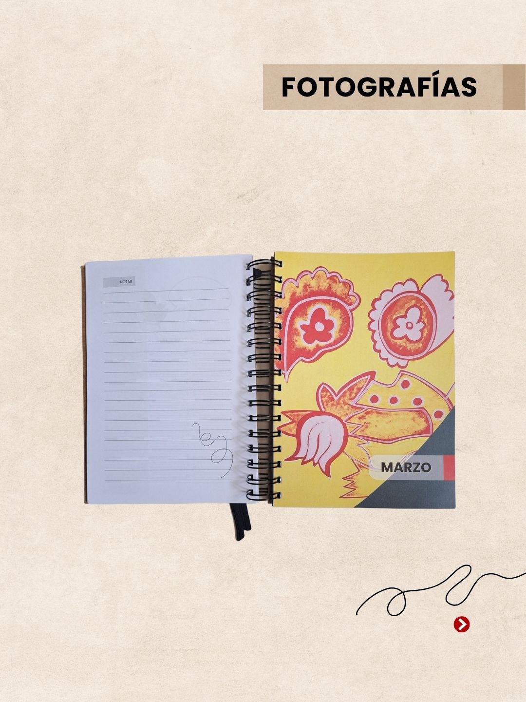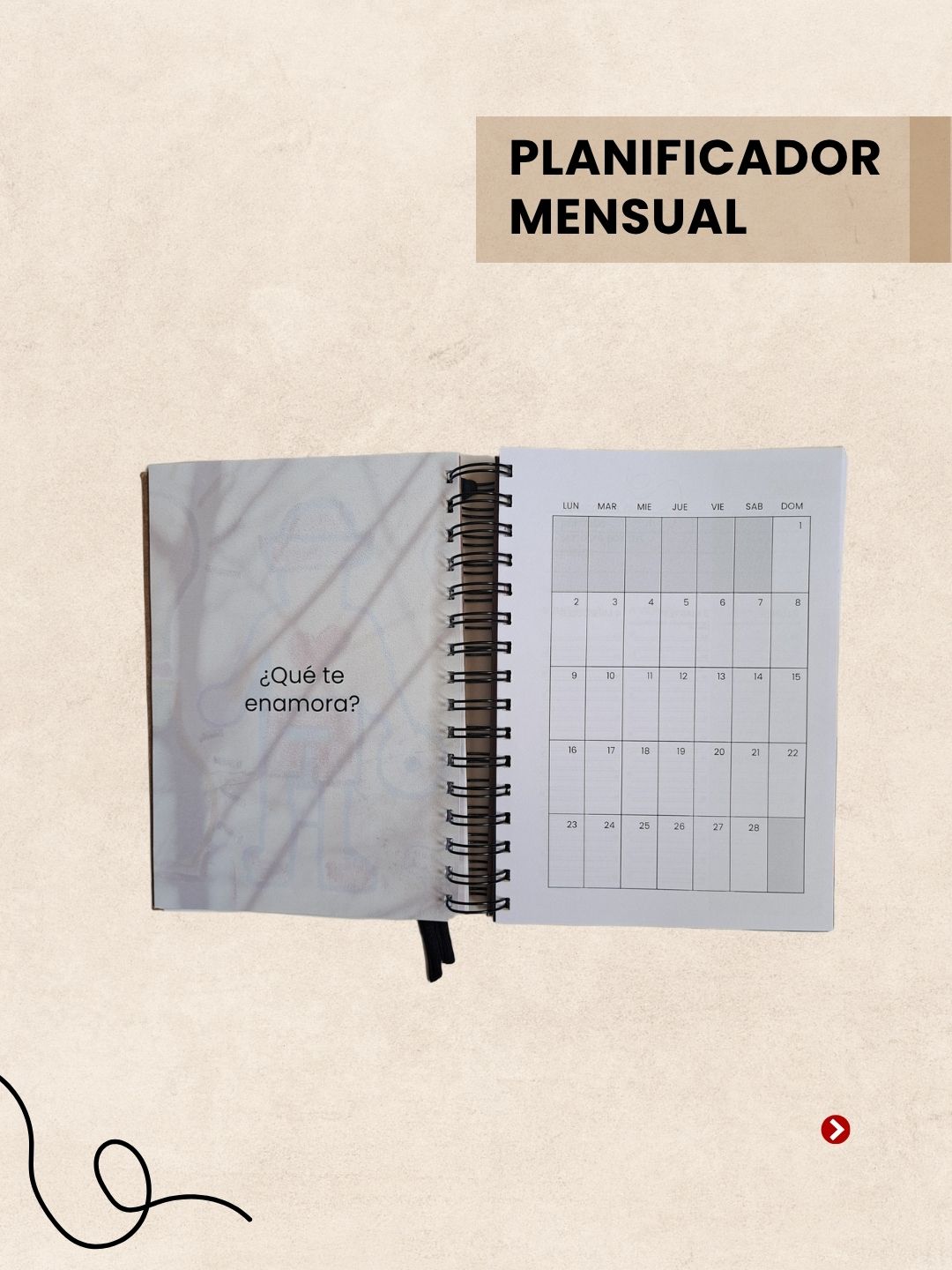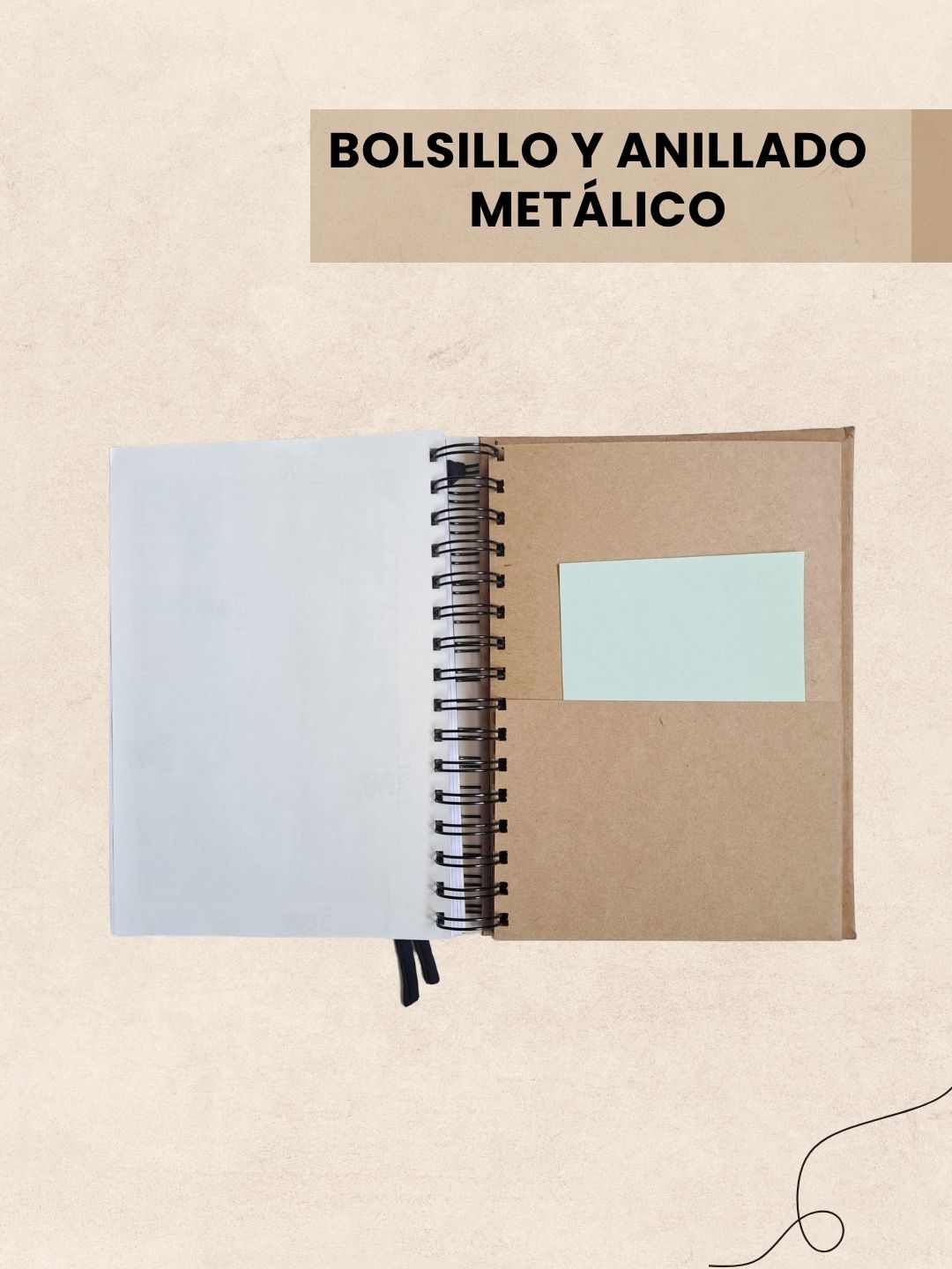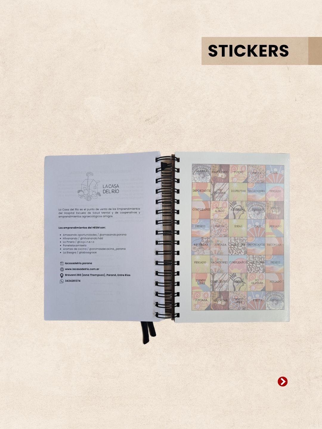 También la agenda cuenta con un planificador mensual, semana a la vista, espacio para anotar y dibujar, stickers, bolsillo y anillado metálico.