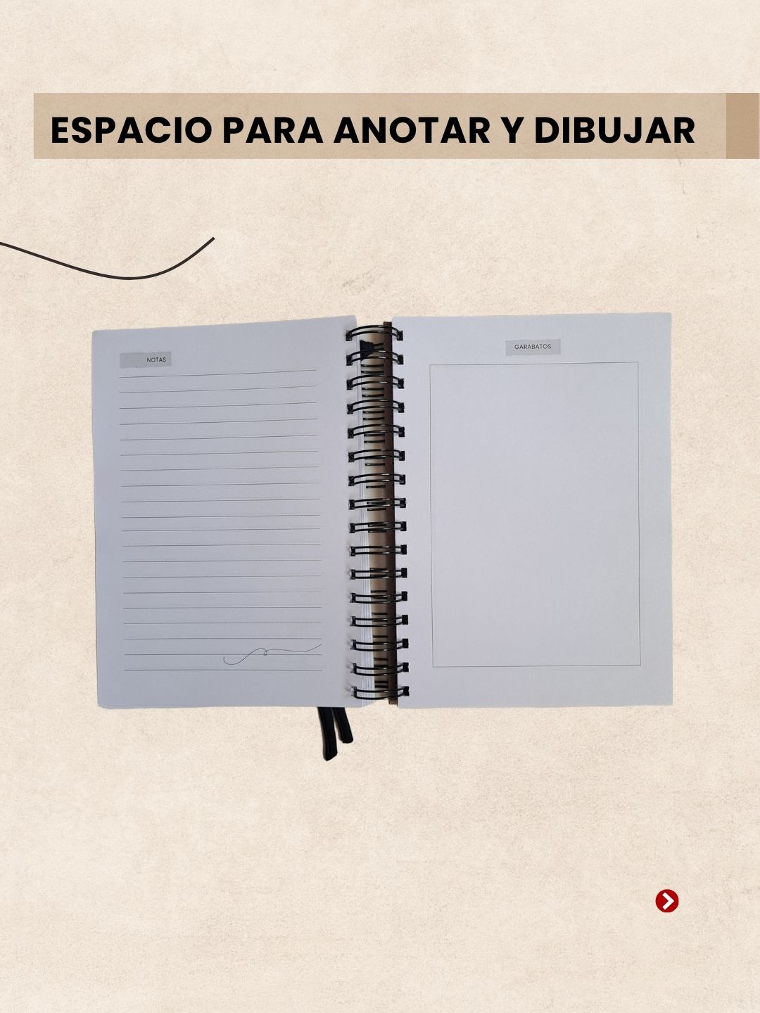También la agenda cuenta con un planificador mensual, semana a la vista, espacio para anotar y dibujar, stickers, bolsillo y anillado metálico.
